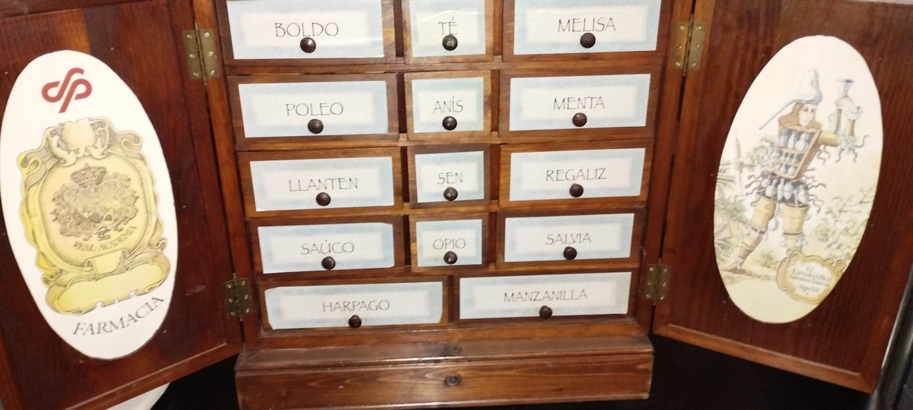 Mueble farmacéutico antiguo REFERENCIA: 112025 Mueble farmacéutico antiguo DESCRIPCIÓN GENERAL Mueble de farmacia de estilo antiguo, elaborado en madera maciza barnizada. Presenta dos puertas frontales decoradas con ilustraciones clásicas relacionadas con la botánica y la Real Academia de Farmacia. En su interior contiene una cajonera con múltiples compartimentos rotulados con nombres de plantas medicinales tradicionales. CARACTERÍSTICAS - Material: Madera maciza barnizada. - Estilo: Vintage / botica antigua. - Cajones: 12 compartimentos con rótulos de hierbas medicinales (Boldo, Té, Melisa, Poleo, Anís, Menta, Llantén, Sen, Regaliz, Saúco, Opio, Salvia, Harpago, Manzanilla). - Decoración: Ilustraciones clásicas del Siglo XVII y escudo de la Real Academia. - Estado: Usado pero funcional y decorativo. - Uso recomendado: Decoración en farmacias, herbolarios, consultas, locales temáticos o viviendas. MEDIDAS (aproximadas) - Ancho: 60–70 cm - Alto: 50–60 cm - Fondo: 25–30 cm OBSERVACIONES Pieza ideal como elemento decorativo. Aporta un toque clásico y distintivo a cualquier espacio.